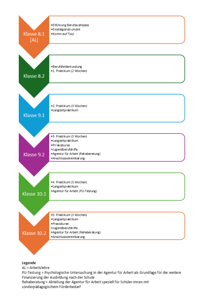 Das folgende Schaubild gibt einen Überblick über die einzelnen Bausteine in der Berufsorientierung an unserer Schule: